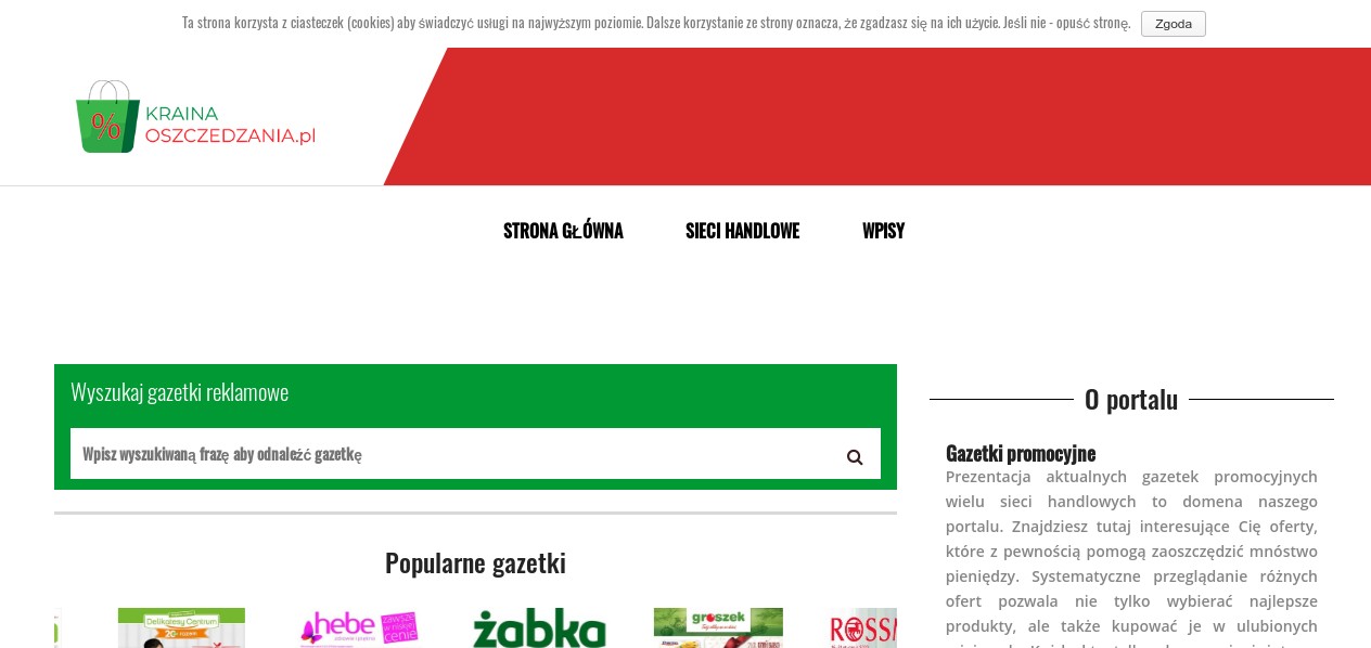 Prezentacja zawsze aktualnych gazetek reklamowych wielu sieci handlowych to domena portalu KrainaOszczedzania.pl. Strona przedstawia oferty, które z pewnością pomogą zaoszczędzić pieniądze i czas na szukaniu produktów atrakcyjnych cenowo. Portal umożliwia swobodne przeglądanie gazetek, w których możesz odnaleźć to, co interesuje Cię najbardziej. Publikujemy gazetki promocyjne Natura, Rossmann, Hebe, a także wielu sklepów spożywczych i nie tylko. Tu możesz oglądać je bez pobierania na dysk.