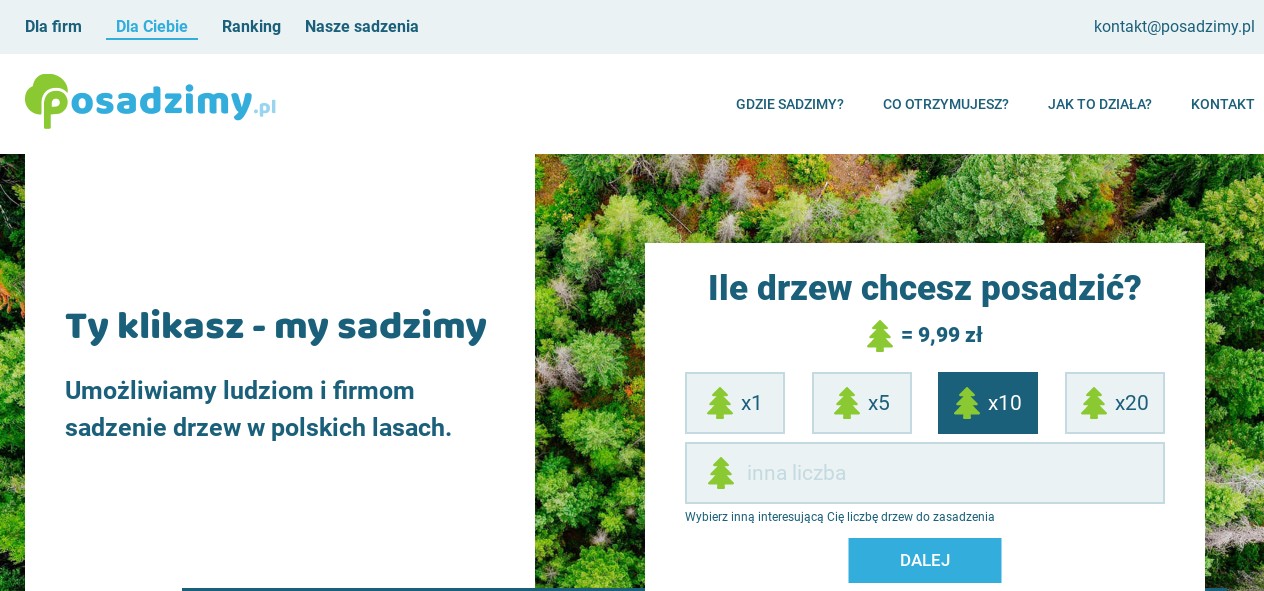Posadzimy.pl to portal, który powstał z pasji do przyrody i dbania o środowisko naturalne. Sadzimy las na zlecenie klientów indywidualnych jak i biznesowych. Do naszej akcji przyłączyło się już wiele osób, chcących przyczynić się do poprawy jakości powietrza i zwiększenia zalesienia w kraju. W zakres proponowanych przez nas usług wchodzi wybór odpowiedniej dla danego terenu sadzonki, przygotowanie miejsca, zasadzenie, wydanie certyfikatu, przygotowanie podstrony i widżetu. Zapraszamy do współpracy.